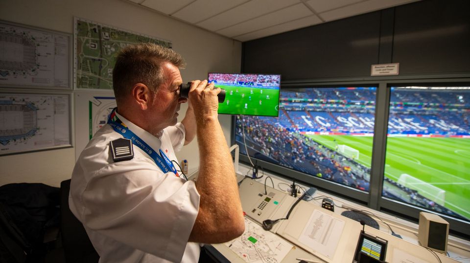 Einsatz des DRK bei der Fußball-Europameisterschaft 2024 in Deutschland. Hier beim Spiel Spanien - Italien in der Arena auf Schalke in Gelsenkirchen. Einsatzkraft mit Feldstecher in der Stadionkanzel