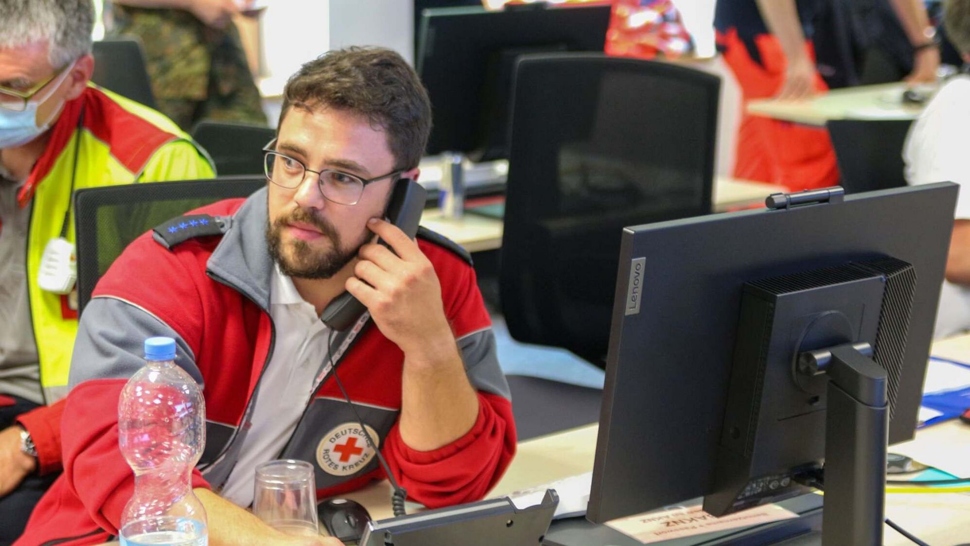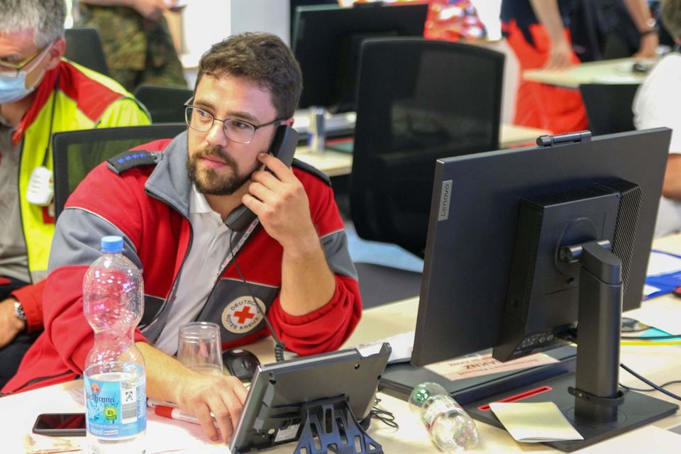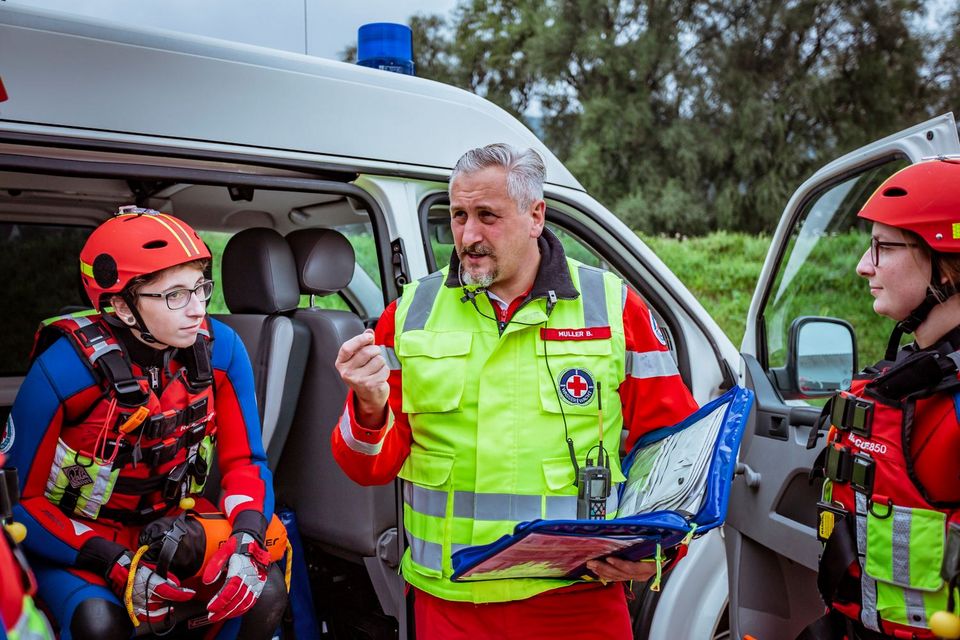 Wasserwacht in Bayern: Helfer bei der Einsatzübung, mit dem Einsatzleiter bei der Besprechung