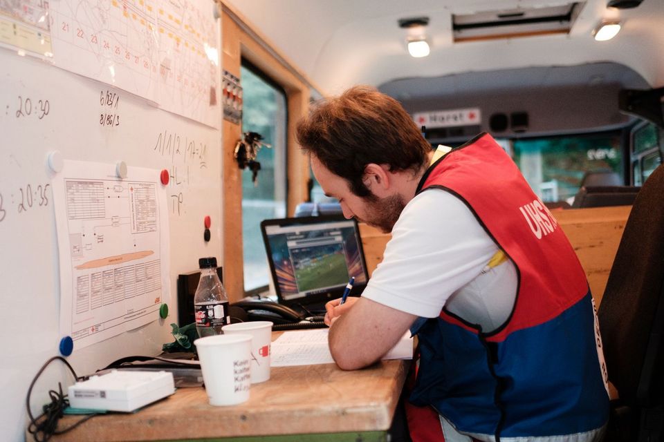 Einsatz von ehrenamtlichen Helfern des DRK-Sanitätsdienstes beim Public Viewing auf der Fanmeile zur Fussball-Weltmeisterschaft 2018 auf der Straße des 17. Juni in Berlin. Helfer bei Schreibarbeiten im Einsatzfahrzeug