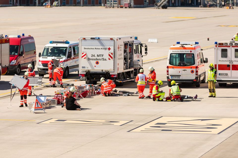 Einsatzübung von DRK und Feuerwehr auf dem Flughafen von Dresden: Fahrzeuge der Feuerwehr und des DRK auf dem Flugfeld. Erste Hilfe Maßnahmen bei Passagieren